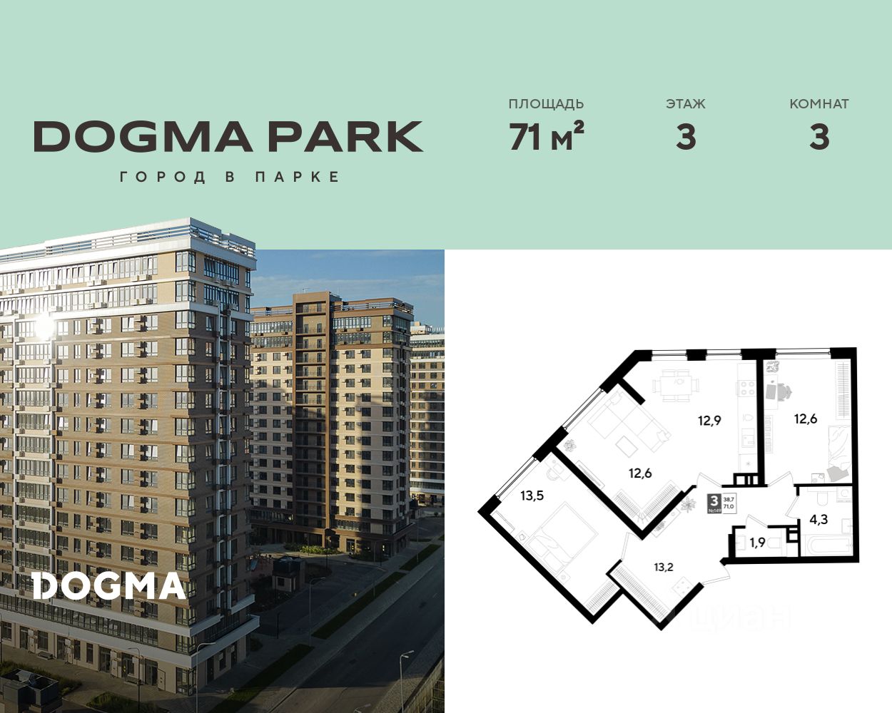 В продаже 3-комнатная квартира от застройщика! Мкр. "DOGMA PARK" г. Краснодар, Литер 30 Срок сдачи: 3 кв. 2027, общей площадью 71 кв.м., на 3 этаже.