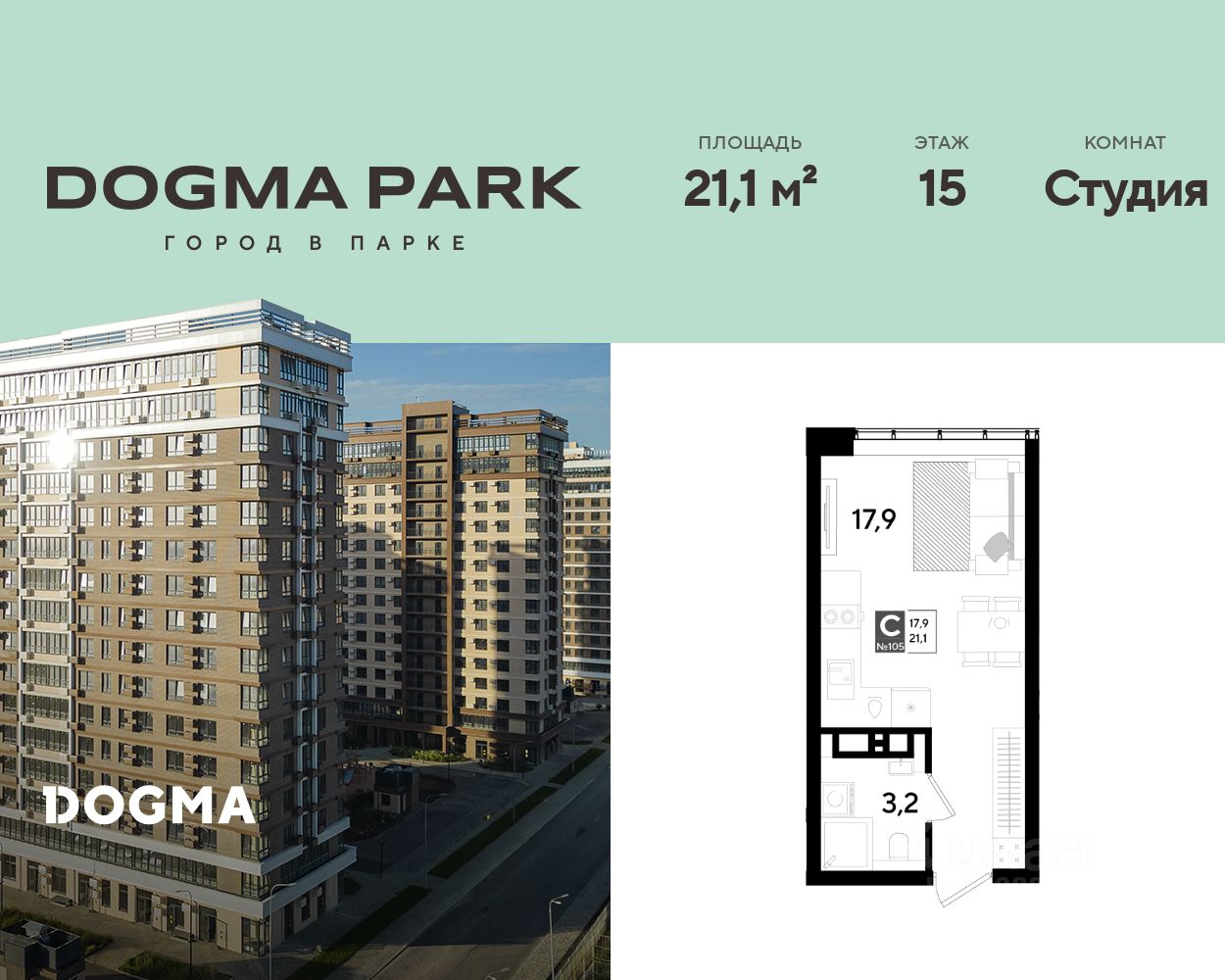 В продаже квартира-студия от застройщика! Мкр. "DOGMA PARK" г. Краснодар, Литер 31 Срок сдачи: 3 кв. 2027, общей площадью 21.1 кв.м., на 15 этаже.