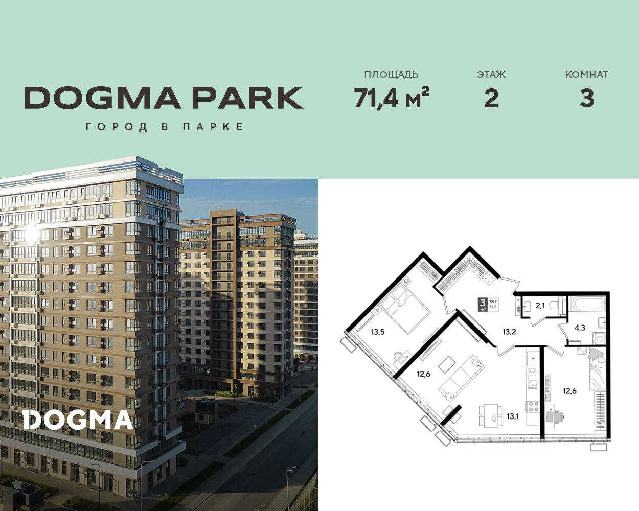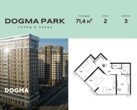 В продаже 3-комнатная квартира от застройщика! Мкр. "DOGMA PARK" г. Краснодар, Литер 32 Срок сдачи: 3 кв. 2027, общей площадью 71.4 кв.м., на 2 этаже.