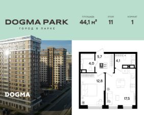 В продаже 1-комнатная квартира от застройщика! Мкр. "DOGMA PARK" г. Краснодар, Литер 32 Срок сдачи: 3 кв. 2027, общей площадью 44.1 кв.м., на 11 этаже.