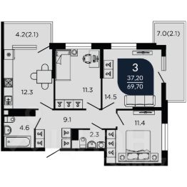 Продается трех комнатная квартира общей площадью 65,5 кв. м., планировка на две стороны. Квартира находиться на 1 этаже этаже 23 этажного монолитно-кирпичного дома комфорт класса. В квартире: прихожая 9,1 кв.м. с двух сторон места под шкафы для верхней одежды; слева от входа первый санузел 4,6 кв.м.; далее против часовой стрелки кухня 12,3 кв.м. с выходом на первый застекленный балкон 4,28 кв.м.; далее три жилых комнаты 11,3 кв.м.; 14,5 кв.м. с выходом на второй Г - образный застекленный балкон 7 кв.м. и 11,4 кв.м.; далее второй санузел 2,3 кв.м. По своему усмотрению распланируйте пространство квартиры под свои пожелания.