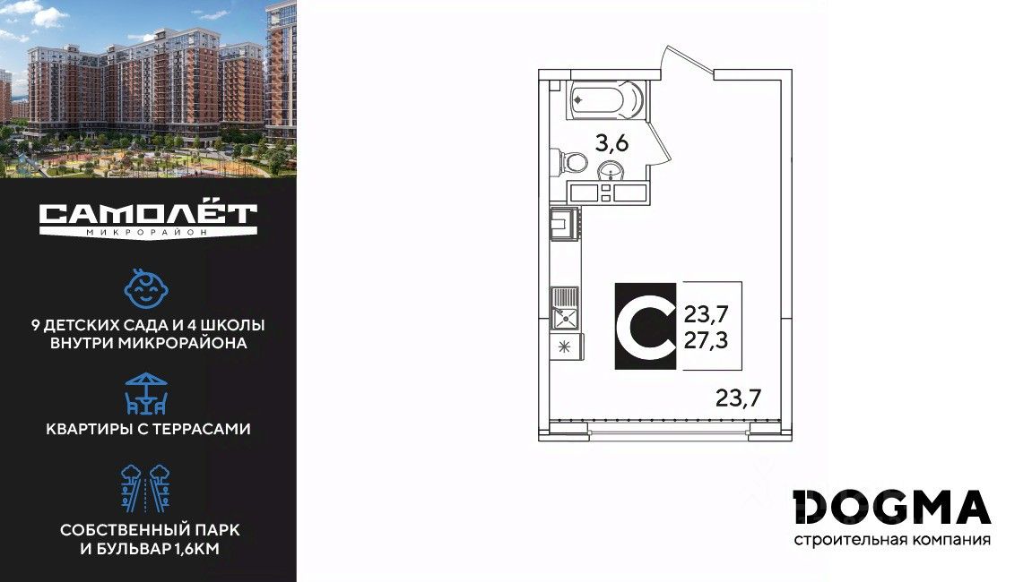 DOGMA - ТОП-3 застройщик по объему строительства в РФ. "САМОЛЁТ" — концептуальный жилой микрорайон, который расположен на северо-западе Краснодара, в районе Западного Обхода. Квартал спроектирован как "город в городе", поэтому здесь будет всё для комфортной жизни: современные дома с разными планировками, дороги, школы и детские сады, поликлиника, торговые центры, парки и аллеи. Микрорайон находится далеко от промышленных предприятий, сочетает удобство городской жизни и экологически благоприятную среду. Инфраструктура нового микрорайона: • 4 школы и 9 детских садов на территории микрорайона • Функциональные планировки • Собственный бульвар протяжённостью 1,6км • Светомузыкальный фонтан протяжённостью 55 метров • Амфитеатр • Парк 7 ГА • Скейт-парк • Детская аква-площадка • Круглосуточное видеонаблюдение и пост охраны Приобрести квартиру можно одним из способов: ипотека, рассрочка, наличный расчет.