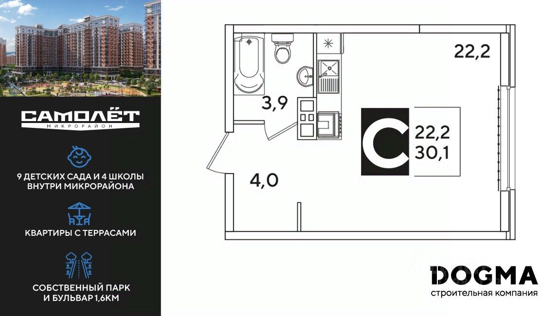 DOGMA - ТОП-3 застройщик по объему строительства в РФ. "САМОЛЁТ" — концептуальный жилой микрорайон, который расположен на северо-западе Краснодара, в районе Западного Обхода. Квартал спроектирован как "город в городе", поэтому здесь будет всё для комфортной жизни: современные дома с разными планировками, дороги, школы и детские сады, поликлиника, торговые центры, парки и аллеи. Микрорайон находится далеко от промышленных предприятий, сочетает удобство городской жизни и экологически благоприятную среду. Инфраструктура нового микрорайона: • 4 школы и 9 детских садов на территории микрорайона • Функциональные планировки • Собственный бульвар протяжённостью 1,6км • Светомузыкальный фонтан протяжённостью 55 метров • Амфитеатр • Парк 7 ГА • Скейт-парк • Детская аква-площадка • Круглосуточное видеонаблюдение и пост охраны Приобрести квартиру можно одним из способов: ипотека, рассрочка, наличный расчет.