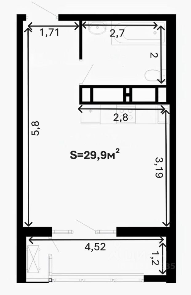 Обратите внимание, что реальная площадь выше заявленной - 29,9м вместо кадастровых 26,9