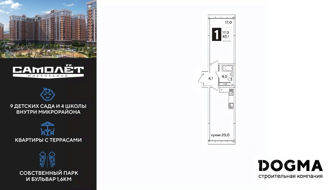 DOGMA - ТОП-3 застройщик по объему строительства в РФ. "САМОЛЁТ" — концептуальный жилой микрорайон, который расположен на северо-западе Краснодара, в районе Западного Обхода. Квартал спроектирован как "город в городе", поэтому здесь будет всё для комфортной жизни: современные дома с разными планировками, дороги, школы и детские сады, поликлиника, торговые центры, парки и аллеи. Микрорайон находится далеко от промышленных предприятий, сочетает удобство городской жизни и экологически благоприятную среду. Инфраструктура нового микрорайона: • 4 школы и 9 детских садов на территории микрорайона • Функциональные планировки • Собственный бульвар протяжённостью 1,6км • Светомузыкальный фонтан протяжённостью 55 метров • Амфитеатр • Парк 7 ГА • Скейт-парк • Детская аква-площадка • Круглосуточное видеонаблюдение и пост охраны Приобрести квартиру можно одним из способов: ипотека, рассрочка, наличный расчет.