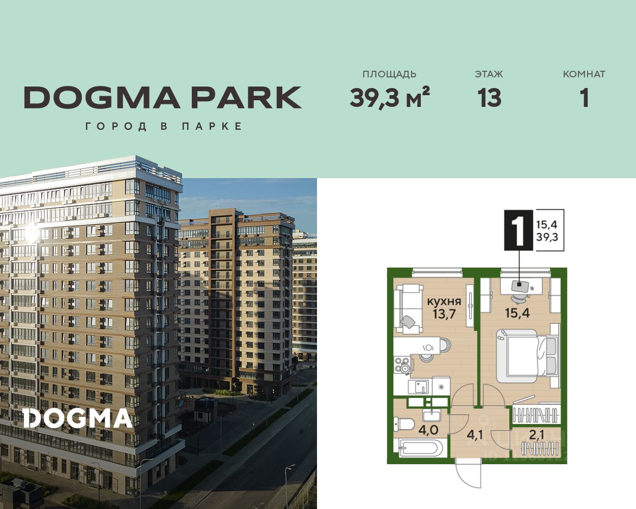 В продаже 1-комнатная квартира от застройщика! Мкр. "DOGMA PARK" г. Краснодар, Литер 23 Срок сдачи: 4 кв. 2027, общей площадью 39.3 кв.м., на 13 этаже.