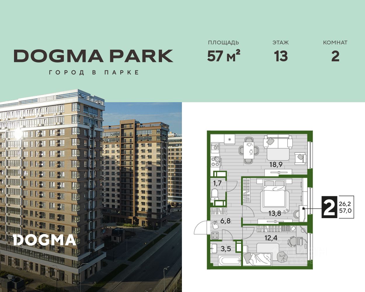 В продаже 2-комнатная квартира от застройщика! Мкр. "DOGMA PARK" г. Краснодар, Литер 24 Срок сдачи: 4 кв. 2027, общей площадью 57 кв.м., на 13 этаже.