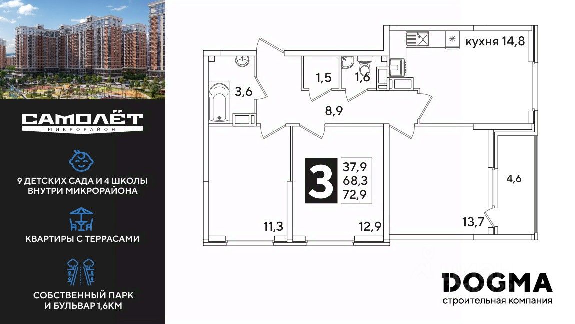 DOGMA - ТОП-3 застройщик по объему строительства в РФ. "САМОЛЁТ" — концептуальный жилой микрорайон, который расположен на северо-западе Краснодара, в районе Западного Обхода. Квартал спроектирован как "город в городе", поэтому здесь будет всё для комфортной жизни: современные дома с разными планировками, дороги, школы и детские сады, поликлиника, торговые центры, парки и аллеи. Микрорайон находится далеко от промышленных предприятий, сочетает удобство городской жизни и экологически благоприятную среду. Инфраструктура нового микрорайона: • 4 школы и 9 детских садов на территории микрорайона • Функциональные планировки • Собственный бульвар протяжённостью 1,6км • Светомузыкальный фонтан протяжённостью 55 метров • Амфитеатр • Парк 7 ГА • Скейт-парк • Детская аква-площадка • Круглосуточное видеонаблюдение и пост охраны Приобрести квартиру можно одним из способов: ипотека, рассрочка, наличный расчет.