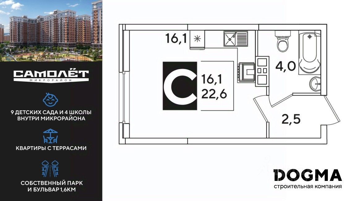 DOGMA - ТОП-3 застройщик по объему строительства в РФ. "САМОЛЁТ" — концептуальный жилой микрорайон, который расположен на северо-западе Краснодара, в районе Западного Обхода. Квартал спроектирован как "город в городе", поэтому здесь будет всё для комфортной жизни: современные дома с разными планировками, дороги, школы и детские сады, поликлиника, торговые центры, парки и аллеи. Микрорайон находится далеко от промышленных предприятий, сочетает удобство городской жизни и экологически благоприятную среду. Инфраструктура нового микрорайона: • 4 школы и 9 детских садов на территории микрорайона • Функциональные планировки • Собственный бульвар протяжённостью 1,6км • Светомузыкальный фонтан протяжённостью 55 метров • Амфитеатр • Парк 7 ГА • Скейт-парк • Детская аква-площадка • Круглосуточное видеонаблюдение и пост охраны Приобрести квартиру можно одним из способов: ипотека, рассрочка, наличный расчет.