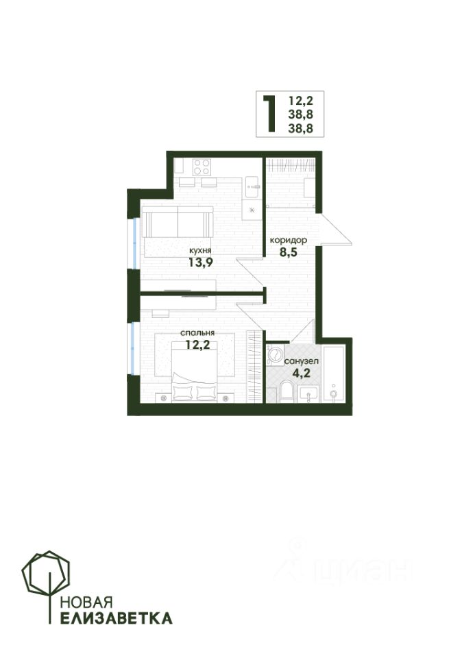 Продаётся 1-комнатная квартира в сданном доме (Дом 1 литер 5), срок сдачи: IV-кв. 2024, общей площадью 38.8 кв.м., на 1 этаже. Уникальный зелёный оазис тишины и спокойствия "Новая Елизаветка" в пригороде Краснодара.