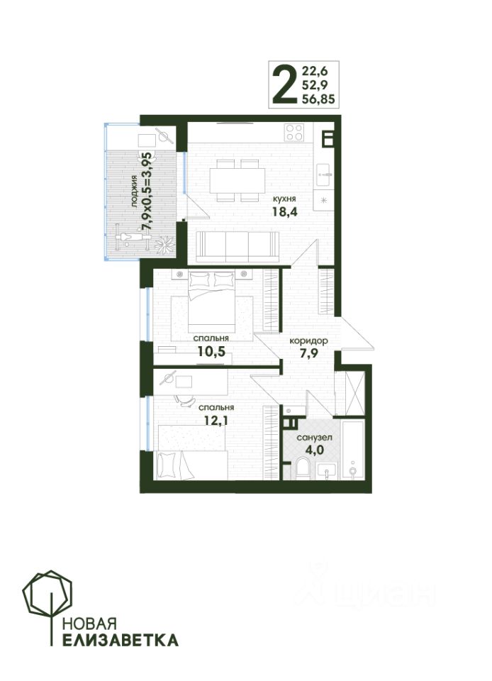 Продаётся 2-комнатная квартира в сданном доме (Дом 1.1 литер 4), срок сдачи: IV-кв. 2024, общей площадью 56.85 кв.м., на 3 этаже. Уникальный зелёный оазис тишины и спокойствия "Новая Елизаветка" в пригороде Краснодара.