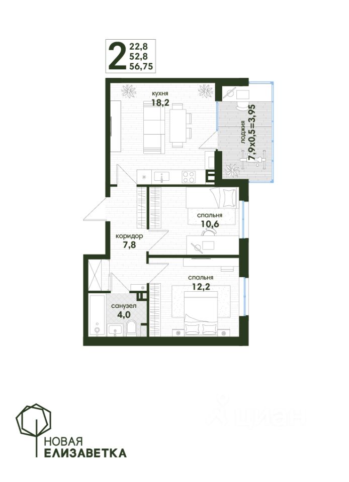 Продаётся 2-комнатная квартира в сданном доме (Дом 1.1 литер 4), срок сдачи: IV-кв. 2024, общей площадью 56.75 кв.м., на 4 этаже. Уникальный зелёный оазис тишины и спокойствия "Новая Елизаветка" в пригороде Краснодара.