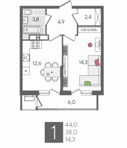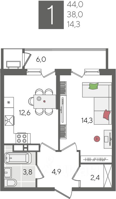 В продаже 1-комнатная квартира от застройщика! ЖК "Рекорд", г. Краснодар, Литер 5, общей площадью 44 кв.м., на 24 этаже.