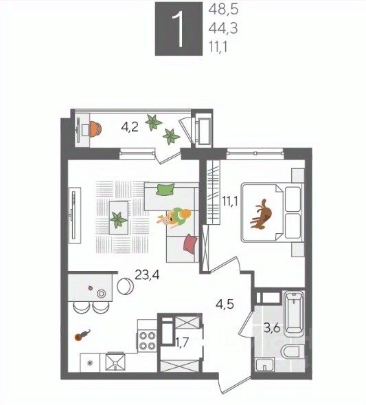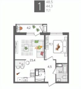 В продаже 1-комнатная квартира от застройщика! ЖК "Рекорд", г. Краснодар, Литер 5, общей площадью 48.5 кв.м., на 11 этаже.