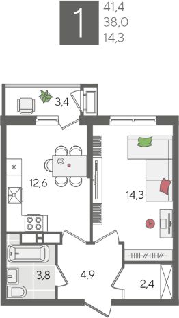 В продаже 1-комнатная квартира от застройщика! ЖК "Рекорд", г. Краснодар, Литер 5, общей площадью 41.4 кв.м., на 11 этаже.