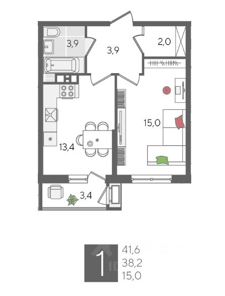 В продаже 1-комнатная квартира от застройщика! ЖК "Рекорд", г. Краснодар, Литер 5, общей площадью 41.6 кв.м., на 3 этаже.