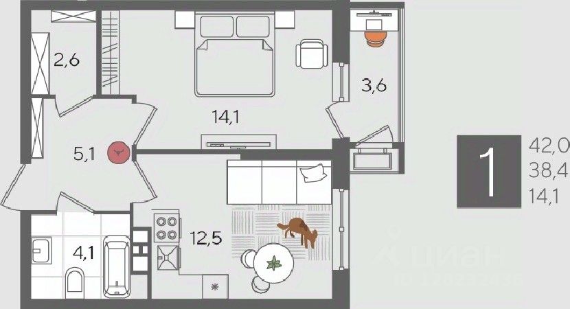 В продаже 1-комнатная квартира от застройщика! ЖК "Рекорд", г. Краснодар, Литер 5, общей площадью 42 кв.м., на 2 этаже.