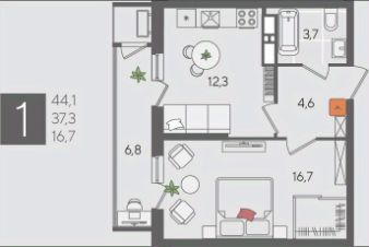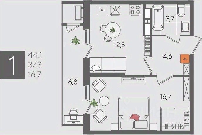 В продаже 1-комнатная квартира от застройщика! ЖК "Рекорд", г. Краснодар, Литер 5, общей площадью 44.1 кв.м., на 24 этаже.
