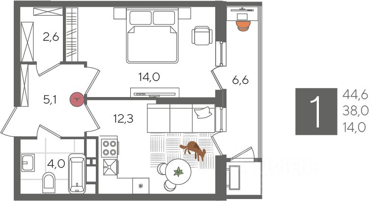 В продаже 1-комнатная квартира от застройщика! ЖК "Рекорд", г. Краснодар, Литер 5, общей площадью 44.6 кв.м., на 24 этаже.