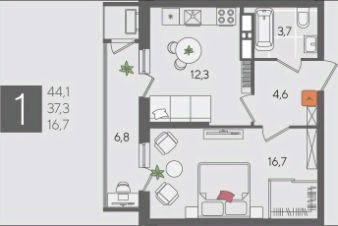В продаже 1-комнатная квартира от застройщика! ЖК "Рекорд", г. Краснодар, Литер 5, общей площадью 44.1 кв.м., на 22 этаже.