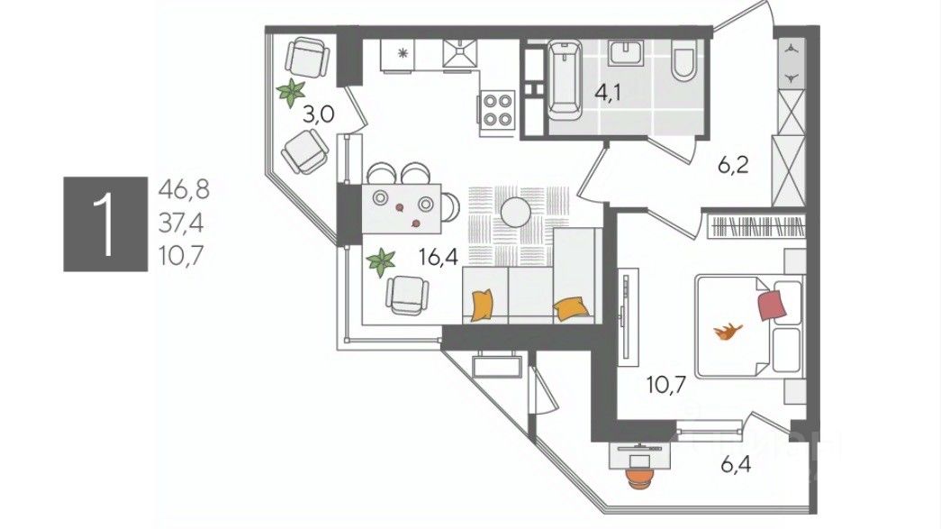 В продаже 1-комнатная квартира от застройщика! ЖК "Рекорд", г. Краснодар, Литер 5, общей площадью 46.8 кв.м., на 19 этаже.