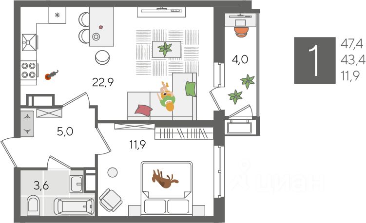 В продаже 1-комнатная квартира от застройщика! ЖК "Рекорд", г. Краснодар, Литер 5, общей площадью 47.4 кв.м., на 11 этаже.