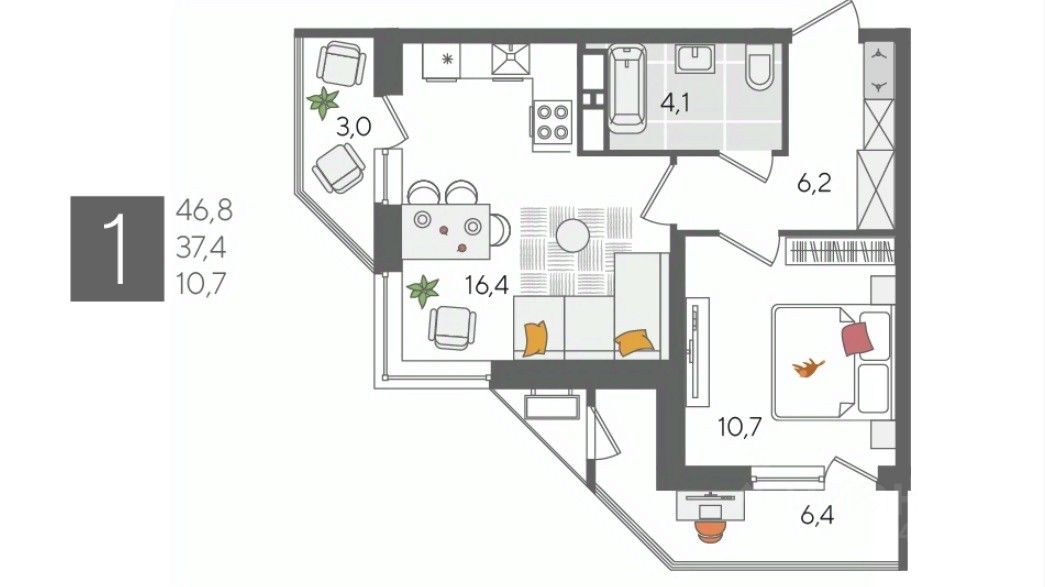 В продаже 1-комнатная квартира от застройщика! ЖК "Рекорд", г. Краснодар, Литер 5, общей площадью 46.8 кв.м., на 11 этаже.