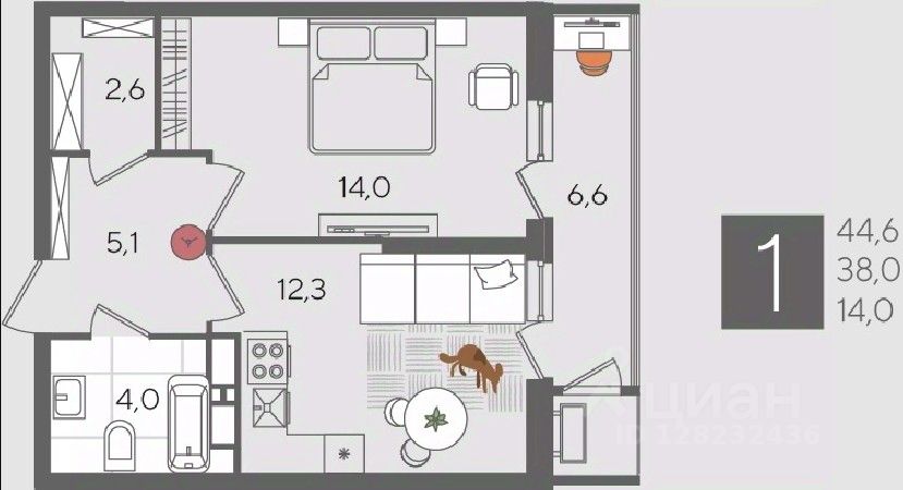 В продаже 1-комнатная квартира от застройщика! ЖК "Рекорд", г. Краснодар, Литер 5, общей площадью 44.6 кв.м., на 24 этаже.