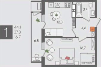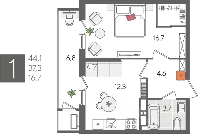 В продаже 1-комнатная квартира от застройщика! ЖК "Рекорд", г. Краснодар, Литер 5, общей площадью 44.1 кв.м., на 24 этаже.