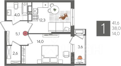 В продаже 1-комнатная квартира от застройщика! ЖК "Рекорд", г. Краснодар, Литер 5, общей площадью 41.6 кв.м., на 14 этаже.