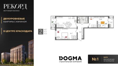 В продаже 2-комнатная квартира от застройщика! ЖК "Рекорд", г. Краснодар, Литер 5, общей площадью 68.7 кв.м., на 13 этаже.