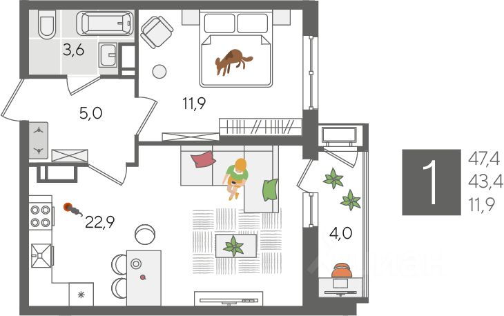 В продаже 1-комнатная квартира от застройщика! ЖК "Рекорд", г. Краснодар, Литер 5, общей площадью 47.4 кв.м., на 13 этаже.