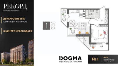 В продаже 1-комнатная квартира от застройщика! ЖК "Рекорд", г. Краснодар, Литер 5, общей площадью 47 кв.м., на 10 этаже.