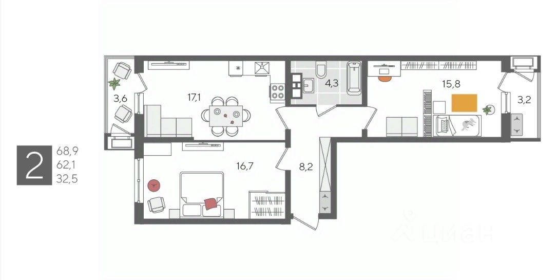 В продаже 2-комнатная квартира от застройщика! ЖК "Рекорд", г. Краснодар, Литер 5, общей площадью 68.9 кв.м., на 8 этаже.