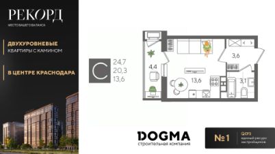 В продаже студия от застройщика! ЖК "Рекорд", г. Краснодар, Литер 5, общей площадью 24.7 кв.м., на 8 этаже.