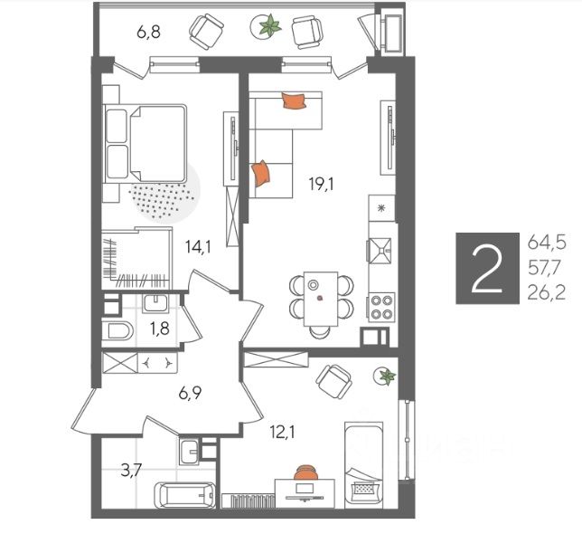 В продаже 2-комнатная квартира от застройщика! ЖК "Рекорд", г. Краснодар, Литер 5, общей площадью 64.5 кв.м., на 5 этаже.