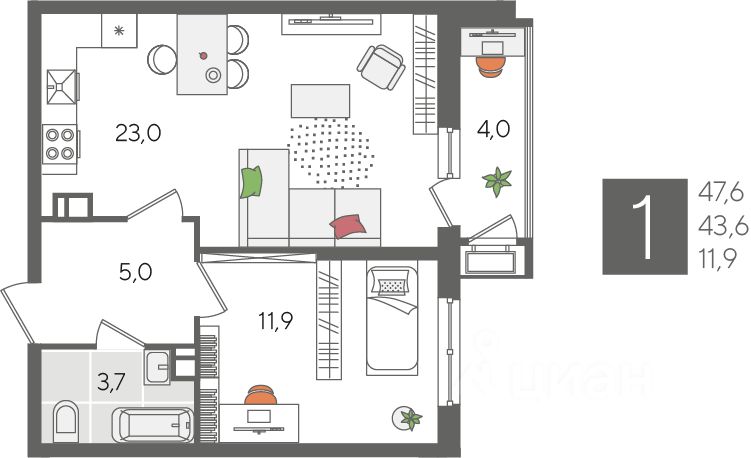 В продаже 1-комнатная квартира от застройщика! ЖК "Рекорд", г. Краснодар, Литер 5, общей площадью 47.6 кв.м., на 3 этаже.
