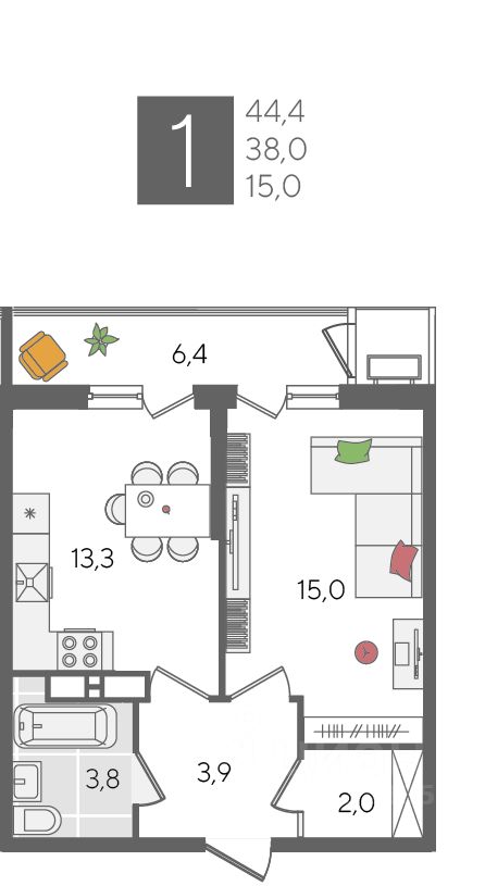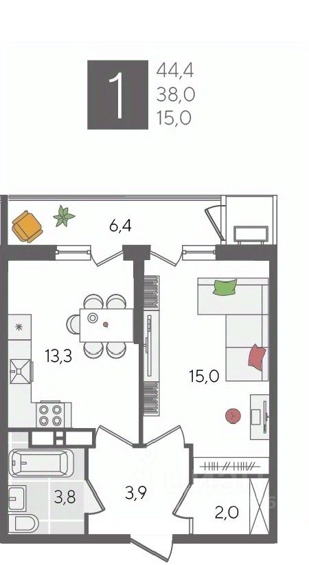В продаже 1-комнатная квартира от застройщика! ЖК "Рекорд", г. Краснодар, Литер 5, общей площадью 44.4 кв.м., на 24 этаже.
