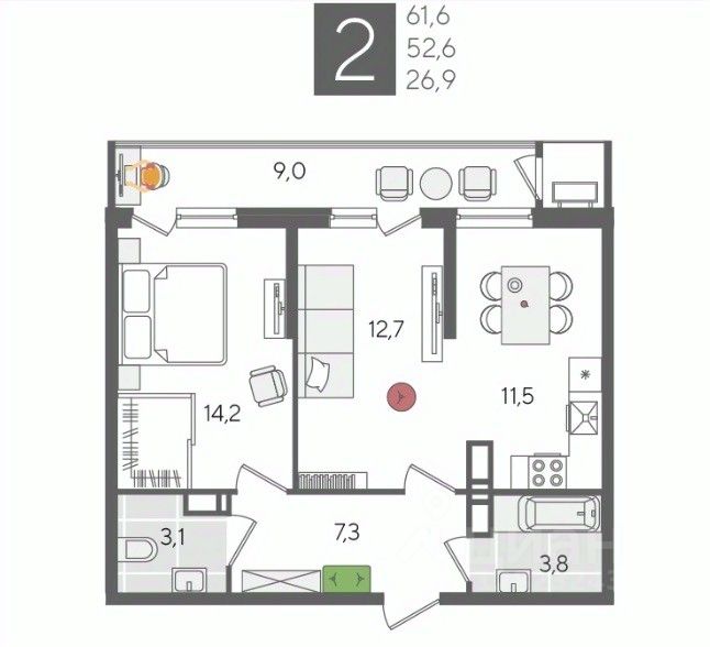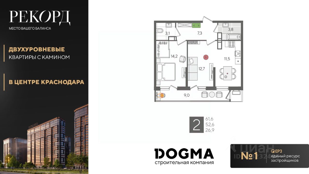В продаже 2-комнатная квартира от застройщика! ЖК "Рекорд", г. Краснодар, Литер 5, общей площадью 61.6 кв.м., на 24 этаже.