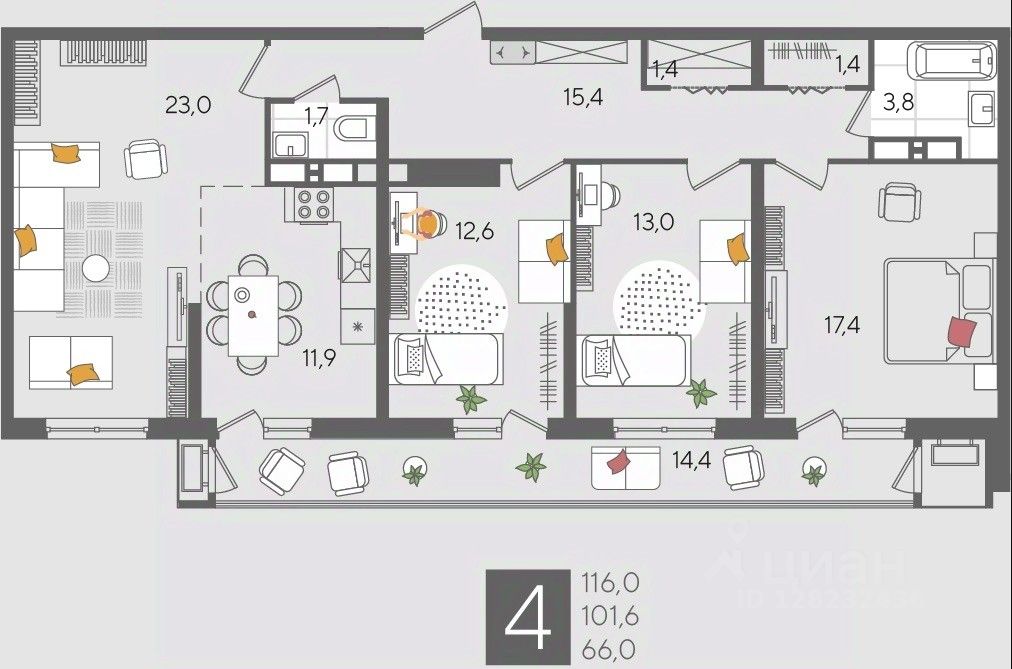 В продаже 4-комнатная квартира от застройщика! ЖК "Рекорд", г. Краснодар, Литер 5, общей площадью 116 кв.м., на 23 этаже.