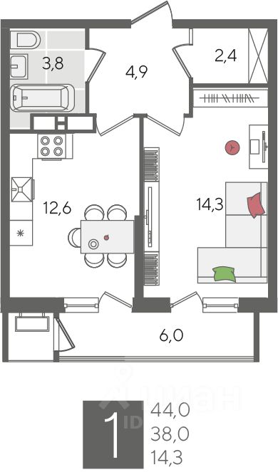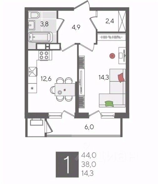 В продаже 1-комнатная квартира от застройщика! ЖК "Рекорд", г. Краснодар, Литер 5, общей площадью 44 кв.м., на 22 этаже.