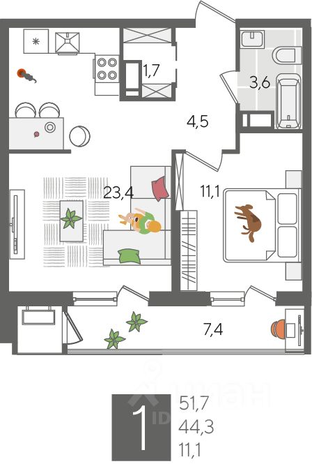 В продаже 1-комнатная квартира от застройщика! ЖК "Рекорд", г. Краснодар, Литер 5, общей площадью 51.7 кв.м., на 22 этаже.