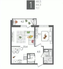В продаже 1-комнатная квартира от застройщика! ЖК "Рекорд", г. Краснодар, Литер 5, общей площадью 48.5 кв.м., на 15 этаже.