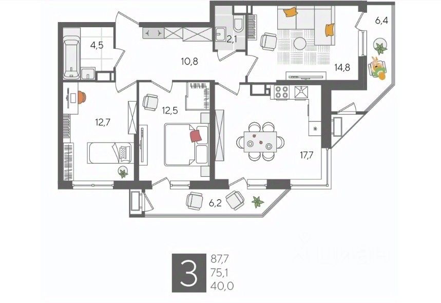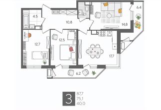 В продаже 3-комнатная квартира от застройщика! ЖК "Рекорд", г. Краснодар, Литер 5, общей площадью 87.7 кв.м., на 14 этаже.