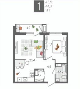 В продаже 1-комнатная квартира от застройщика! ЖК "Рекорд", г. Краснодар, Литер 5, общей площадью 48.5 кв.м., на 14 этаже.