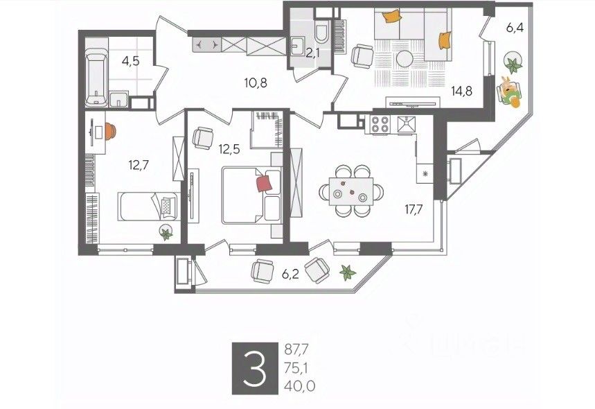 В продаже 3-комнатная квартира от застройщика! ЖК "Рекорд", г. Краснодар, Литер 5, общей площадью 87.7 кв.м., на 13 этаже.