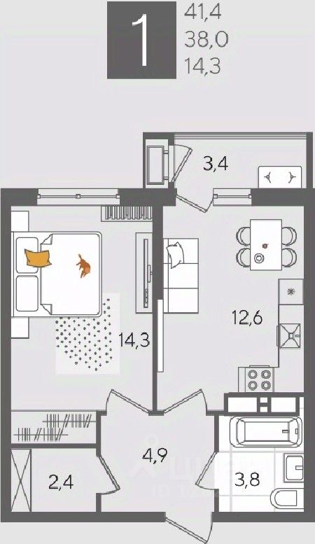В продаже 1-комнатная квартира от застройщика! ЖК "Рекорд", г. Краснодар, Литер 5, общей площадью 41.4 кв.м., на 11 этаже.