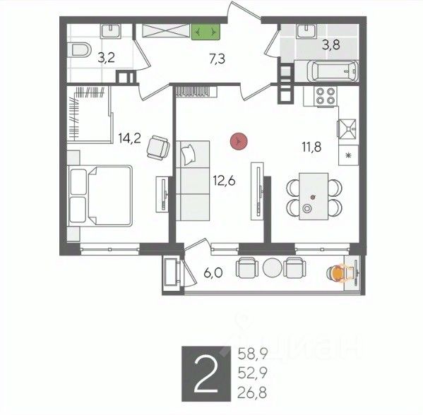 В продаже 2-комнатная квартира от застройщика! ЖК "Рекорд", г. Краснодар, Литер 5, общей площадью 58.9 кв.м., на 10 этаже.