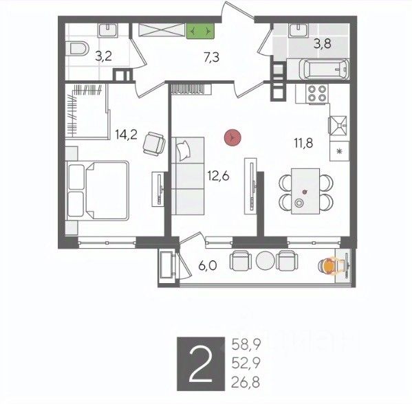 В продаже 2-комнатная квартира от застройщика! ЖК "Рекорд", г. Краснодар, Литер 5, общей площадью 58.9 кв.м., на 8 этаже.