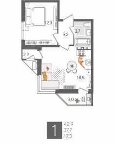 В продаже 1-комнатная квартира от застройщика! ЖК "Рекорд", г. Краснодар, Литер 5, общей площадью 42.9 кв.м., на 7 этаже.